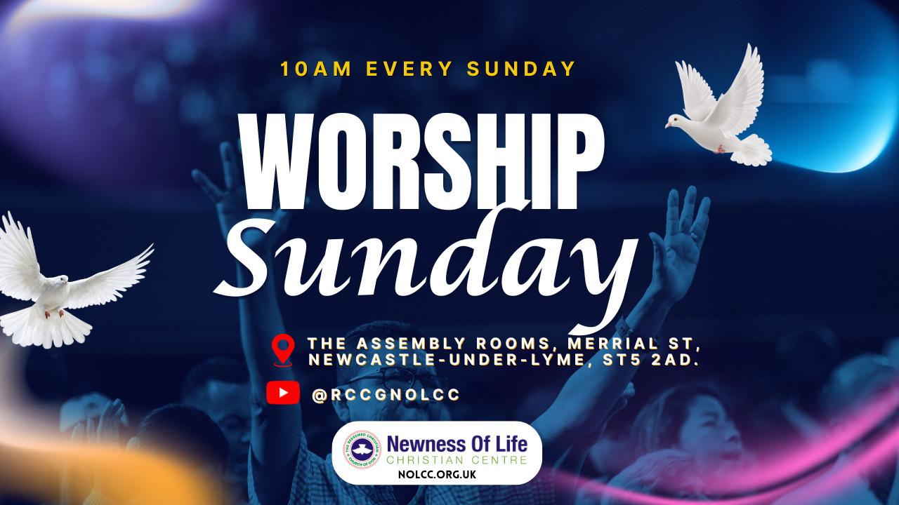 Event: Sunday Celebration Service Date: Every Sunday morning Time: 10am Organised by: NOLCC Location: On-site @ The Assembly Rooms, Merrial St, Newcastle-under-lyme, ST5 2AD. Streaming: Yes. YouTube @rccgnolcc Entry: Free Additional Info: Kindly come early…