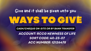 Cash/cheque On-site or by Bank Transfer Account: RCCG Newness of Life Sort code: 40-23-07 Account Number: 12126478